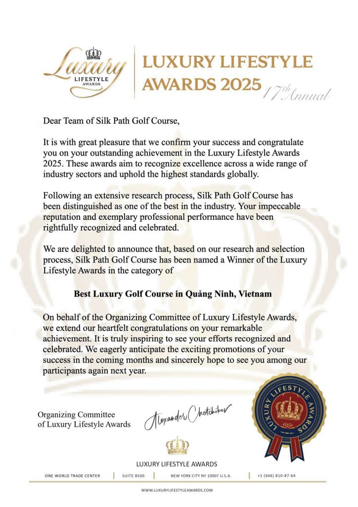 Giữa hàng trăm đề cử toàn cầu, danh hiệu “Best Luxury Golf Course in Quang Ninh, Vietnam” dành cho PGA Silk Path Đông Triều tại Luxury Lifestyle Awards 2025 là minh chứng thuyết phục cho chất lượng dịch vụ, tầm nhìn chiến lược và nỗ lực không ngừng trong hành trình khẳng định vị thế golf Việt Nam.